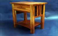 I was asked to make a whole bedroom full of furniture by a friend. I didn't quite make it all, well I made everything except the bed. This photo of one of a pair of bedside tables is all that remains of the photos I took. I ended up making a blanket box, dresser table & the bedsides. It is made of Black Wattle from a log I bought from a logger who was working up in the Daintree aera of North Queensland. The dimensions are: 600mm (W) X 350mm (D) X 600mm (T) and was finished with an oil/varnish mix. The front edges of the top and shelf are scolloped and meat safe mesh was used on the sides.
