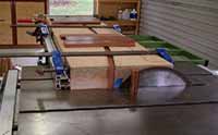 Having so long to think about this project I came to the conclusion that a well made laminating form was the key to the successful outcome. The whole job was dependent on the form as it was used to create the curved apron, cut the correct angles on the ends, hold the apron so the ends could be mortised & support the apron while the arch was cut. This photo shows the end docking procedure. |