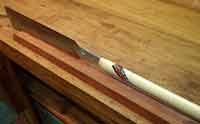 In this picture the apron has just come out of the form after laminating 5 pieces of 4.7mm Rosewood. It has had a light sand and a coat of lacquer. It has still to be trimmed to length. |