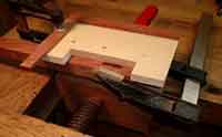 I built this one setup jig to cut the mortices in the legs. The timber strip on the left is the left stop. I used loose tennons for all the base joinery. Mortices were 35mm X 7.9mm (5/16th) X 15mm deep. |