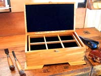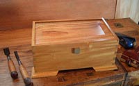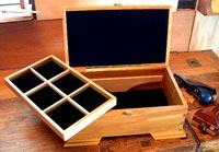 Asked to make a jewelry box for a work colleagues' girlfriend for Xmas, this was the result. The carcase is New Guinea Rosewood and the raised panel was made of Camphor Laurel. A small item till was created with Silver Ash dividers and till support. The interior of the box was lined with double black velvet. A small brass latch was installed & the finish was Nitrocellulose lacquer.