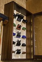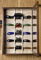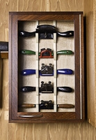 I was given the timber that I used for the carcass quite a few years ago by a mates' father. The Old Growth Australian Red Cedar came out of the Bank of New South Wales that was in the main street of Brisbane. It was old growth when it was cut & it had been in the bank almost 100 years! It's almost impossible to find Red Cedar this colour these days. The wood used for the back wall of the cabinet is an American timber that was originally floorboards..... I can't remember it's name. The spoke shave racks are hand cut from a piece of Silver Ash & are one piece each.