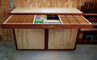 I needed a place to store screws & fittings so I put in a full width draw with dividers. Häfele full extension draw slides were used to maximize the usable space. I reckon it'll be enough to hold all the crap. It has the usual adjustable shelving & was finished with lacquer.